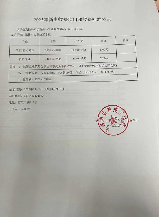 2023年新生收费项目和收费标准公示